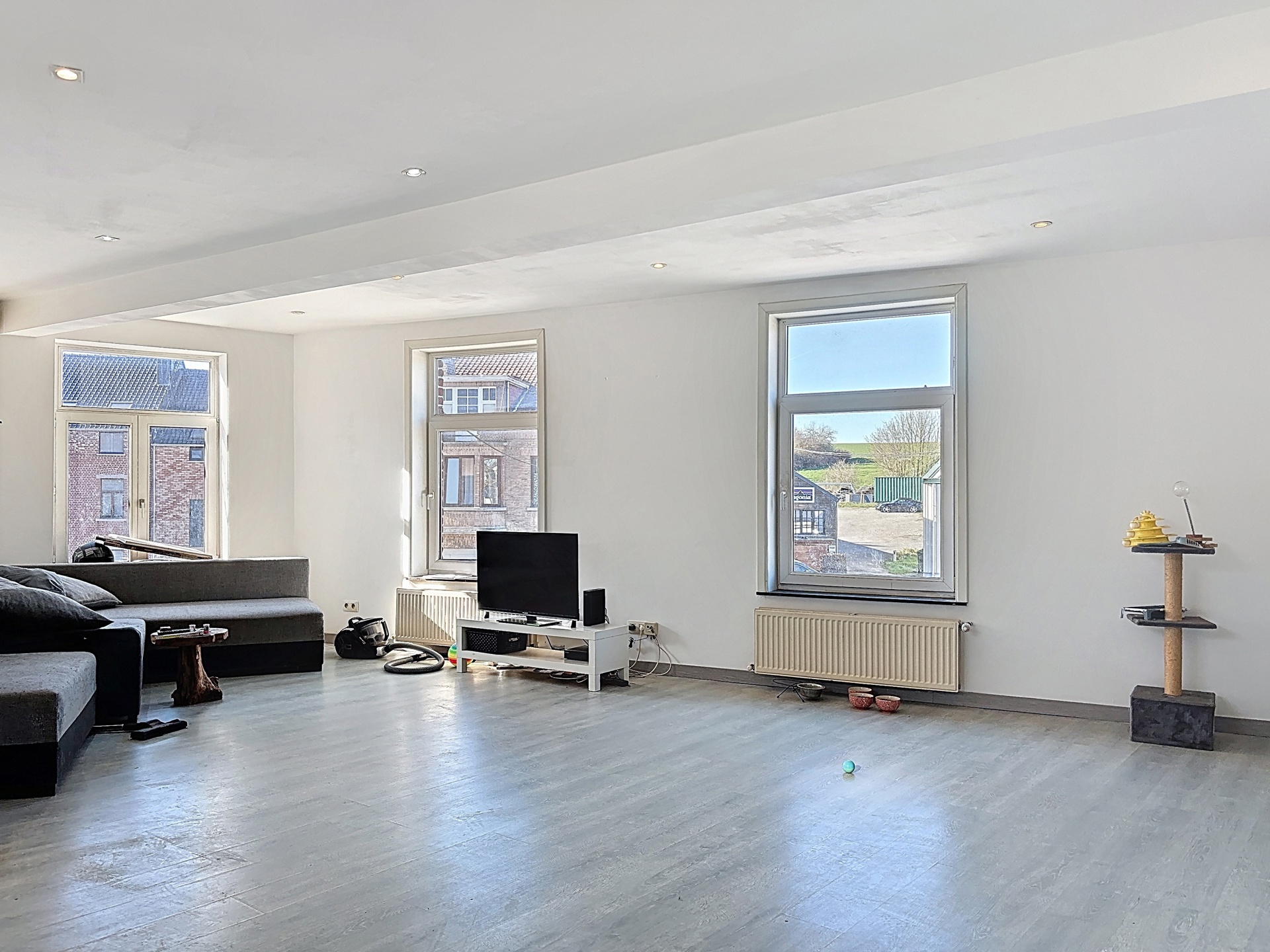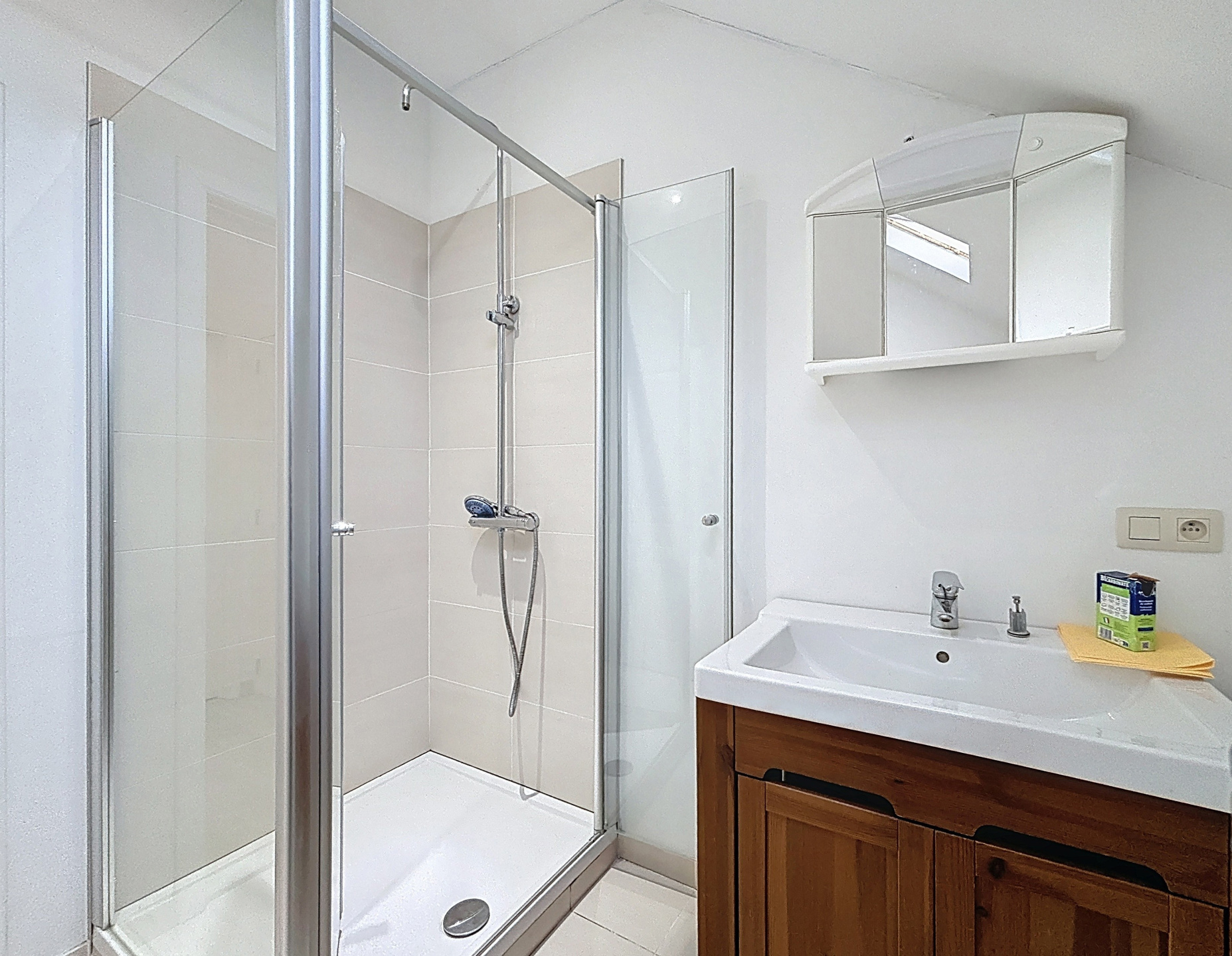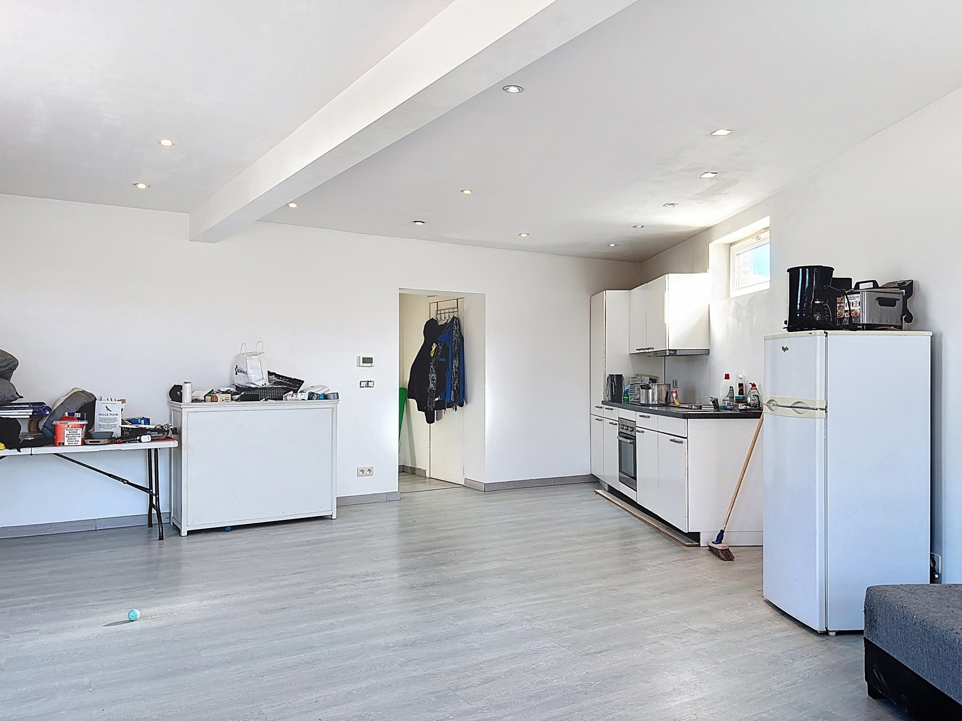 L’appartement se compose comme suit : un hall d’entrée donnant accès à l’étage où se trouve la partie principale du logement. Un second hall dessert une buanderie ainsi qu’une salle de douche avec WC. L’appartement dispose également de deux chambres d’environ 12 m² et 11 m², ainsi que d’un séjour spacieux et lumineux de +/- 38 m² avec cuisine ouverte entièrement équipée. Stationnement aisé à proximité.